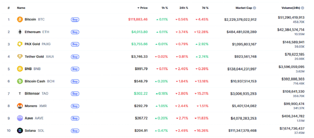 PAX Gold (PAXG), a token backed by physical gold, ranks third. Its price is $3,755 (96.64% lower than Bitcoin).